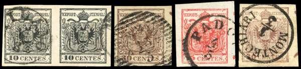 Lombardy and Venetia: 1854-57 10c black 'machine paper' pair used with Milano cds in black, good to large margins all around, Pfenninger mark on the back. Also offered with 30c hand paper with Sermide cancel, 15c machine paper with Padova cancel and 30c machine paper with Montechiari cancel. SG 6b, £1,000, Sassone 19, €1,650.