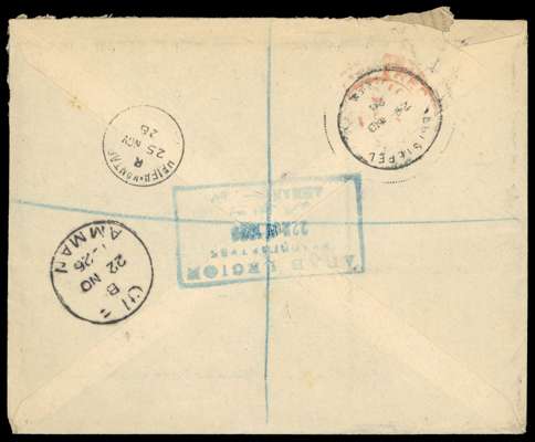 Jordan 1926 (22 NO) stampless registered ‘Arab Legion’ printed envelope to London, Certified Official handstamp top left in blue plus at bottom left, in same colour, framed handstamp ARAB LEGION/ Headquarters/ Amman. Amman cds at right, handstamp repeated on reverse together with cds and Palestinian transits and red Registered arrival date stamp, scarce