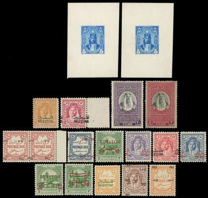 Jordan accumulation with 1950s Hashemite Kingdom 3f and 20f unissued engraved King Abdullah stamps mint, as usual in imperfect condition, one slight thin, other lightly browned corner, two blue 5f proofs, some stamp varieties with 1953 Obligatory tax 3m double and one inverted plus further invert with Palestine overprint, etc, fair to fine