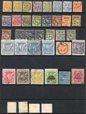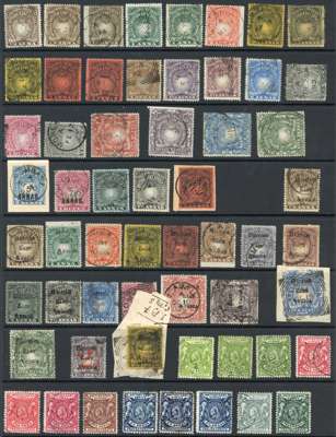 1890-1903 range (95), a useful lot but with some faked cancels. 1890 set, the 8a grey, 1r grey, 2r, 4r and 5r with faked cancels; 1894 surcharge pair, 1895 5a and 7½a and ½a ‘TECR’; 1895 handstamps set, 3r faked cancel; 2½a on 4½a; 1896 set; 1897 surcharges on Zanzibar complete; 1897-1903 1r the three shades and 3r, but the 2r, 4r, 5r and 10r have faked cancels, as well as the 20r where a ‘killer’ has been applied over the Specimen overprint. Also included is a faked overprint on a purported SG 61 (the forger probably shouldn't have picked a stamp with a Rangoon postmark). A good lot, but care needs to be taken with the cancels, even those not mentioned as fakes