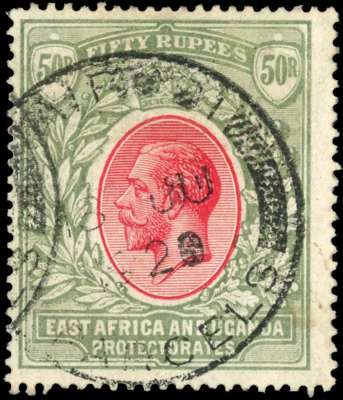 1912-21 50r dull rose-red and dull greyish green, watermark MCA. Used example with Nairobi Parcels CDS of 18 JU 1920 (Proud PP5). Fine, and a rather splendid commercial usage. SG 61, £1000