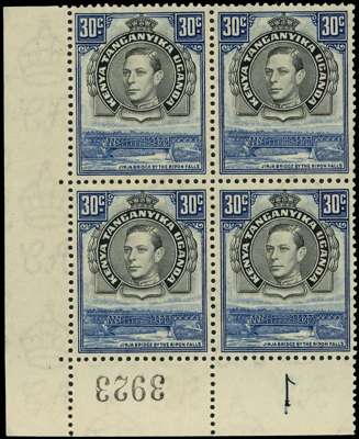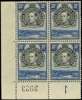 1938 30c black and dull violet-blue perf 13¼ lower left corner block of four, showing both Plate numbers and sheet number. Unmounted o.g., well centred and with very good gum for this stamp. SG 141, £240