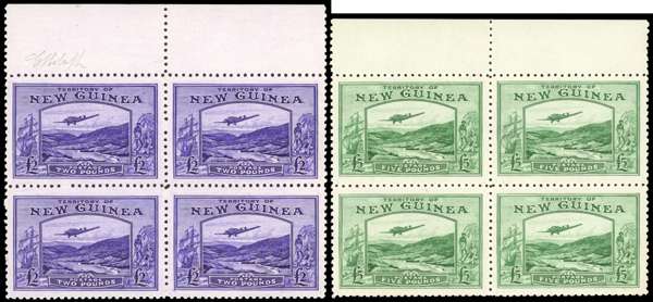 New Guinea SG 204/05 1935 Air £2, £5 blocks of 4 mint