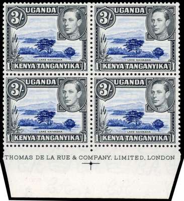 1942-7 3/- dark ultramarine and black perf 13 x 11¾ imprint block of four, fine unmounted o.g. SG 147, £300