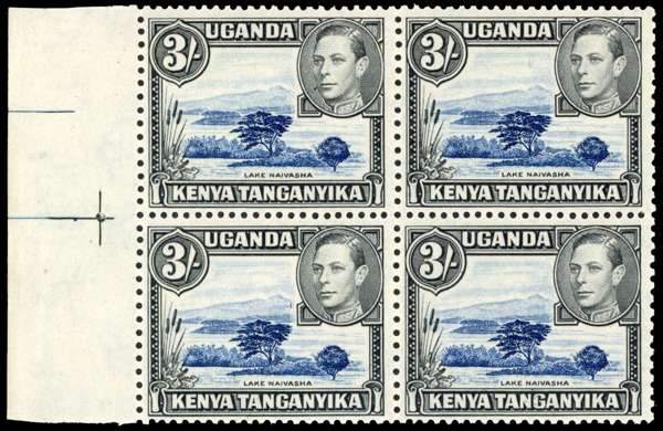 1947 3/- deep violet-blue and black positional block of four with R6/1 ‘cave’ on mountain, unmounted o.g., a rare positional piece. SG 147a