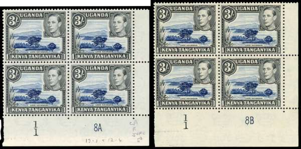 1950 3/- perf 13 x 12½ Plate 1-8A and 1-8B blocks of four, unmounted o.g. Fine. SG 147ac, £440
