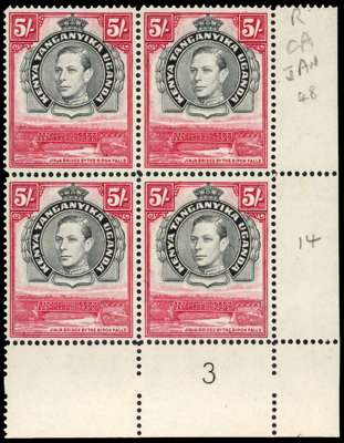 1948 (Jan.) reissue of the 5/- perf 14 in black and dull carmine, unmounted o.g. lower right corner block of four with Vignette Plate 3. Contemporary pencilled ‘R CA JAN 48’ on selvedge. Rarely offered reissue multiple. SG 148a var, £240