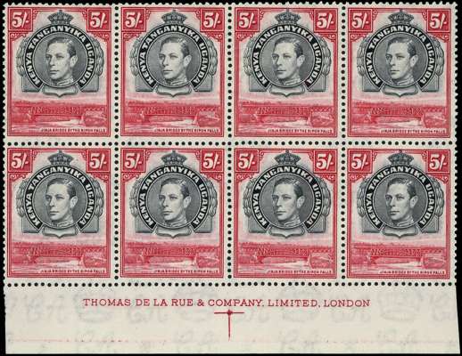 1944-54 5/- perf 13¼ x 13¾ imprint block of eight, lightly hinged on two stamps only, the remainder unmounted o.g. SG 148b, £440