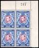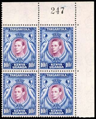 1938-41 10/- lake and blue perf 13¼, the second printing with clear gum. Top right corner block of four with sheet number, a rare multiple, fresh unmounted o.g. SG 149 var