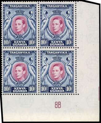 1954 10/- purple and steel-blue lower right corner block of four with Vignette Plate 8B, unmounted o.g. Fresh and fine multiple of this sumptuous shade (CW 32a). SG 149b var