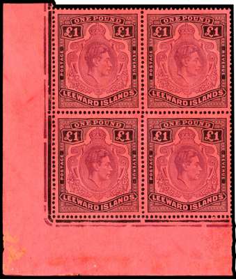 1942 (Oct.) £1 deep purple and black on carmine-red paper lower left corner block of four, unmounted o.g. HPF #49 cut scroll, and #38 damaged cross on crown, the latter flaw very rare. Left selvedge splitting away, otherwise fine. SG 114a var