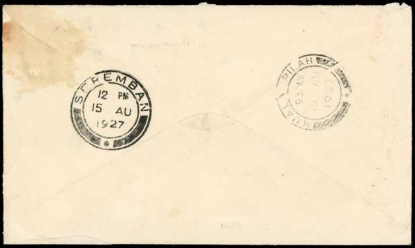 1927 envelope addressed to England bearing 1922-34 6c tiger tied by “SRI MENANTI/15 AUG 1927” double-ring ds (type D2), the earliest recoded date with a further strike alongside, and backstamped by Kuala Pilah and Sereban transit cancels; a few peripheral imperfections otherwise fine. Rare. SG 64.