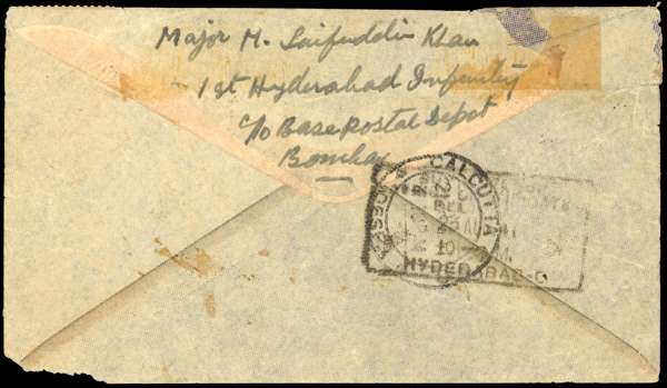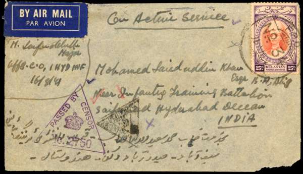 1941 envelope annotated ‘On Active Service’ and sent by Major Saifuddin Khan of the First Hyderabad Infantry addressed C/o Base Postal Depot, Bombay, India bearing 1937-40 25c tied by “FPO 34/16 AUG 41’ cds, showing triangular British ‘PASSED BY/CENSOR/2750’ and smaller “FIELD/CENSOR” marks, the reverse with dispatch and arrival cancels. Some peripheral faults, nevertheless a most unusual cover. Scarce. SG 48.