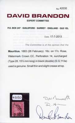 1883 16c on 17c rose (15½mm surcharge) with the surcharge double. Brandon Certificate (2013), ‘…. genuine. Small thin and slight crease at top’, still a respectable example of a rare stamp. SG 113a, £3000
