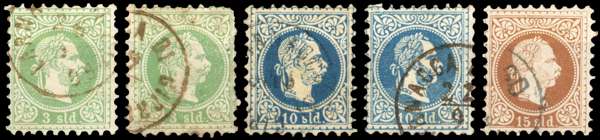 Austrian Post in Levant small group of Larnacca Di Cipro cancels with Coarse Whiskers 3sld used with one pulled perf and another with poor perfs at right, 10sld coarse (3) and fine whiskers 15sld with only small part cancel, 1881 and 1882 incoming entires from Trieste one with Larnaca cds and the other the squared circle, this also with Alexandrien thimble transit.