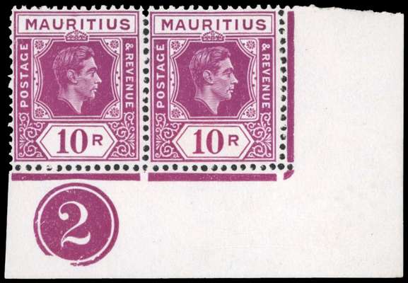 Mauritius SG 263ab 1943 10r Plate pair R10/5 serrated edge mint