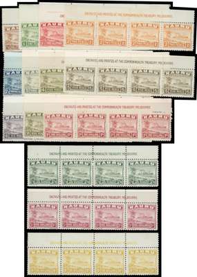 1924-48 Ship set of fourteen in top marginal imprint strips of four, unused, nearly all without gum. Mixed papers to 1/-, with the 2/6d, 5/- and 10/- on the later paper. SG btw. 26A/39B
