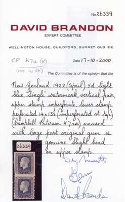 1915-30 5d light blue, perf 14x13½, vertical pair, the top stamp error Imperforate, fresh mint large part o.g., minor gum wrinkle still spectacular and rare. Brandon cert (2000). SG 424aa, cat £850