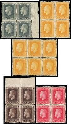 1916 1½d to 6d, wmk 43 (widely spaced and sideways on 2d, 3d, 6d), mint accumulation comprising 1½d perf 14x14½ block of 9, the central row no wmk (SG 431ba), 1½d ‘two-perf’ block of 4, the right no wmk (SG 431ca), 1½d upper left corner block of 6 with plate number ‘14’, the central row no wmk (SG 431a), 2d block of 4, the upper pair no wmk (SG 432a) and similar block of 6 but with wmk just impinging on lower row, 3d upper marginal block of 4, the upper row no wmk (SG 433a), and 6d block of 4 (2 - one upper marginal with part plate number ‘23’), the upper pairs no wmk (SG 434a), fine o.g., a very interesting lot of these seldom seen stamps, the 6d plate block rare. SG 431/434a, cat approx £1100