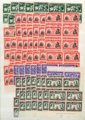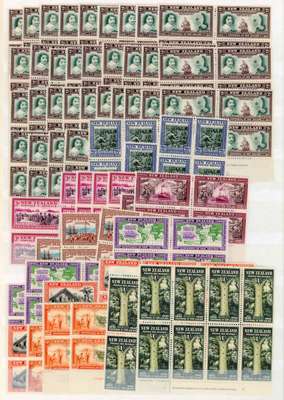 1940 Centennial Plate blocks (and a few plain blocks) with ½d (7), 1d (30), 1½d (7), 2d (46), 2½d (3), 3d (5), 4d (2), 5d (3), 6d (3), 7, 8d (2), 9d (3) and 1/- plain block and imprint block of eight (the latter lightly hinged on two only). All mint, either unmounted or hinged on two only. SG 613-625