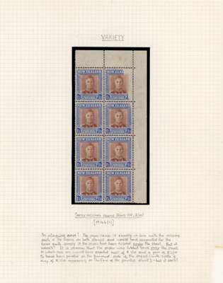 1947-52 1/3d red-brown and blue top right corner block of eight (2 x 4) with a paper fold mainly affecting the corner stamp, which is missing a good portion of the frame, but shows the whole vignette. Unmounted o.g., toned spot on R4/9 and another on the top selvedge. SG 687 var