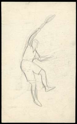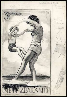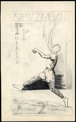1960s period Health unadopted essays by Maurice R Smith. A 2d+1d design depicting a male tennis player, in pencil and ink, on paper (155x250mm), another rough sketch on the reverse; and a more finished essay (some creasing) of a 3d+1d value depicting a mother swinging a child, on paper (170x250mm), in pencil, ink and wash, additional marginal details.
