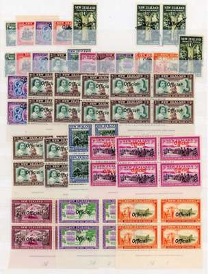 Officials. 1940 Centennial set mint values includ2ing 8d and 1/- unmounted, and Plate blocks unmounted; 2d A9, G9, G10, H9, H10 and J8; 2½d A1; 3d B1 and B2 (B hinged); 4d, 6d and 8d A1. Also used set. SG O141-151
