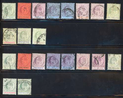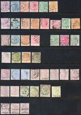 1874-1906 used collection (66) complete for basic stamps, plus 1876 4d sideways watermark, 1893 ½d on 4d double surcharge, and 1905 2½d smaller letters. Mixed condition, some of the early cancels are killers as usual; the 1886 5s and 10s have CDSs, however. 1887 2s6d and 10s are washed; 1904 high values are fair only; 1904 10s very fine with part Abo(h) CDS