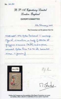 1894 ‘½’ on half of 2d grey-green and carmine, used on piece with Opobo River CDS of 9.10.94. BPA Certificate (2005); the piece has subsequently become toned. SG 59, £375