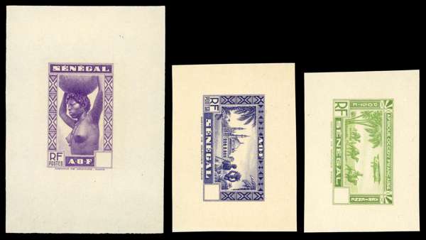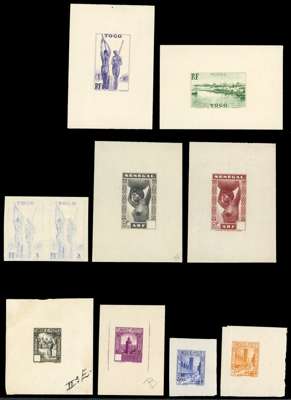1930s-1940s collection of French Colonies, die proofs, on unwmkd wove paper, in issued colours, some with and without values, including: Senegal 1935-40 55c, 60c & 2f50 types, with 1f25 air mail, Togo 1941 4c and 45c, 3c horizontal pair faint impression in blue on unwmkd gummed wove paper, possibly caused by an offset of the plate (?), and Tunisia 1931 values to 75c, some odd imperfections, still largely fine and interesting group.