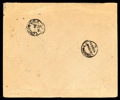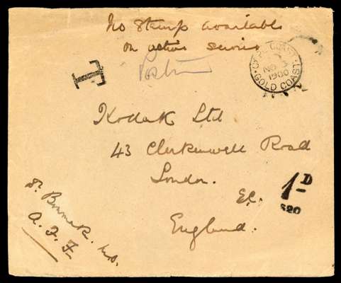 POSTAL HISTORY: 1900 stampless envelope to London endorsed ''No stamp available on active service'' cancelled by Cape Coast Gold Coast cds for NO 3, with 'T' and ' 1d' tax marks indicating that the cover was charged on arrival, backstamped by London arrival for NO 26, some peripheral wear still attractive and scarce.