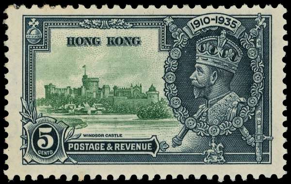 1935 Silver Jubilee 5c green and indigo, with lightning conductor variety, plate 3, R.2/5, large part o.g. SG 134c
