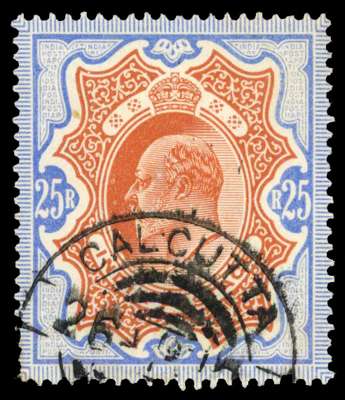 1902-11 25r brownish orange and blue, used Calcutta telegraphic cds, dated 26 (12?) 12, small surface stain, otherwise fine, well centred example SG 147 £600