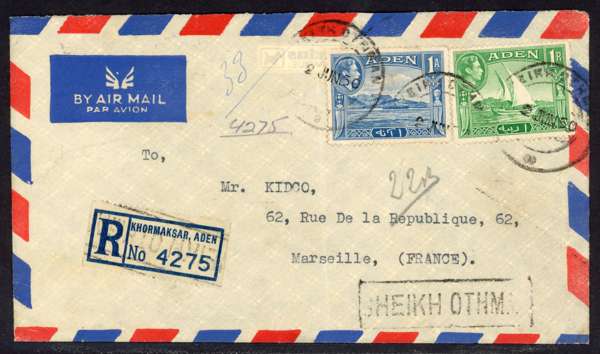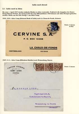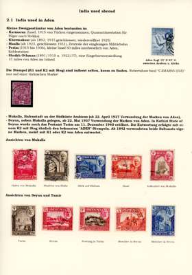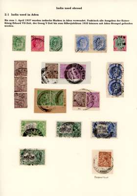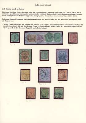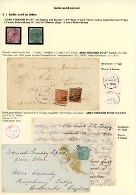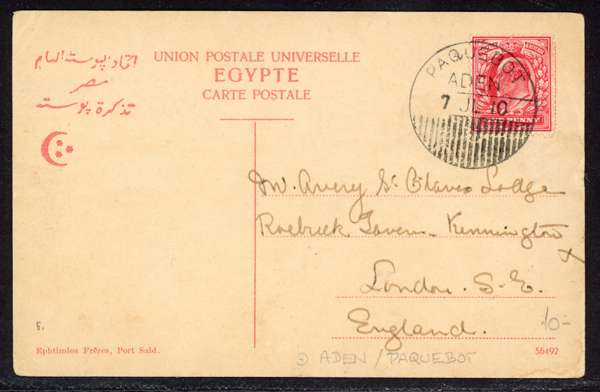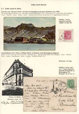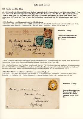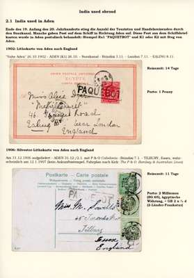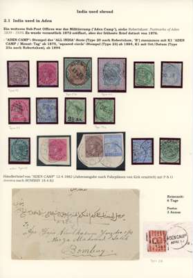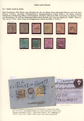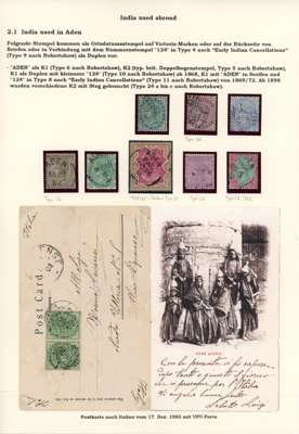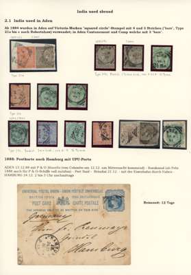 ADEN: 1854-1950s collection of India Used Abroad incoming and out going mail and the later issued stamps, including: 1854 ½a, 4a & 2a with Aden ‘124’ rhomboids, examples with ‘125’ rhomboids later QV issues with 1895 rupee higher values and officials, Aden Cantonment markings and Aden Camp, Paquebot postmarks with Egypt picture postcard franked by GB KEVII 1d, further picture postcard with circular Paquebot Aden mark for 7 JL 10, generally fair to fine condition.