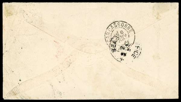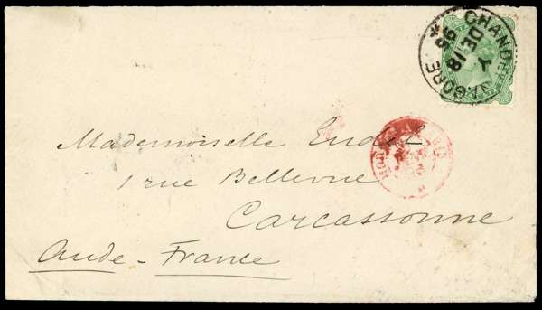FRENCH INDIA: 1895 cover to France franked by 2a6p yellow-green, neatly tied by Chandernagore cds for DE 18, with French transit mark for JAN 5 96 below, backstamped by Sea Post Office d/s for DE 21 and Carcassonne arrival 6 JAN, most attractive and scarce cover. SG 103