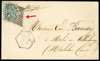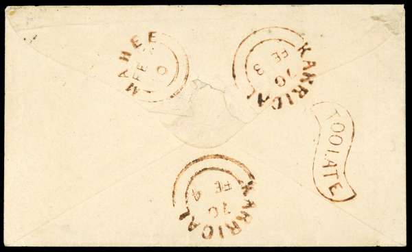 FRENCH INDIA: 1870 envelope to Mahee, franked by ½a pale blue (Die I) tied by ‘147’ type 12 numeral cancel for Karrical, with arrival Octagon mark at foot, backstamped by Karrical despatch and arrival marks for FE 3 & 4, 'Too Late scroll and Mahee mark for FE 7, cover with small minor pinholes, still a most attractive and scarce cover. SG 55