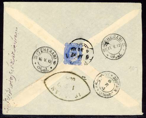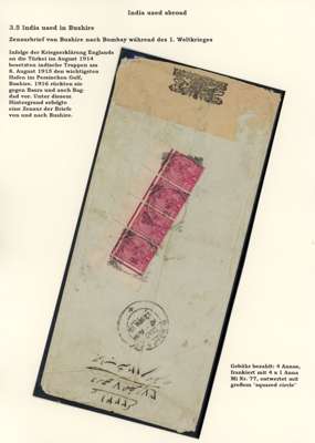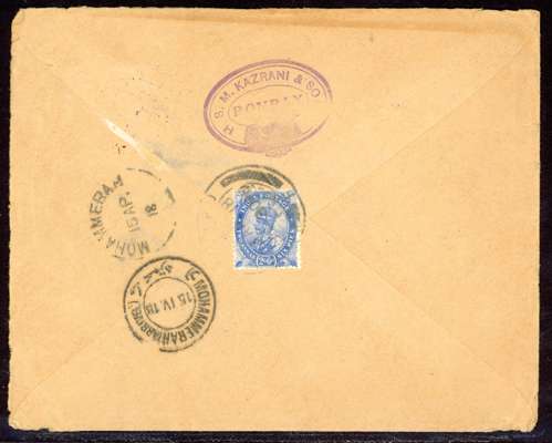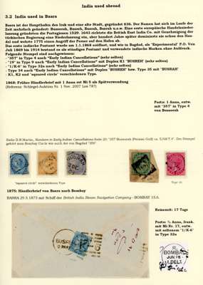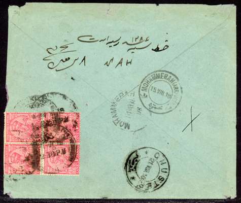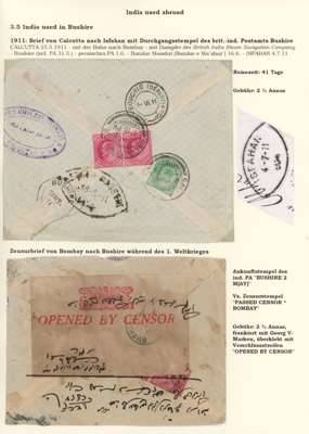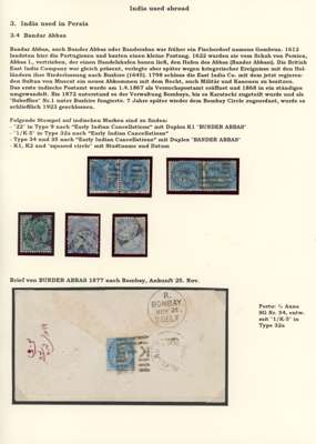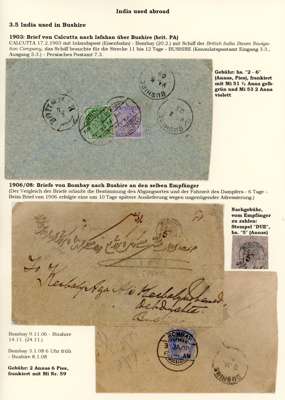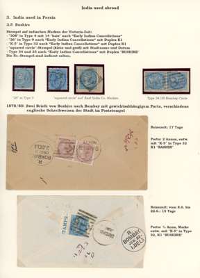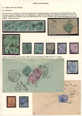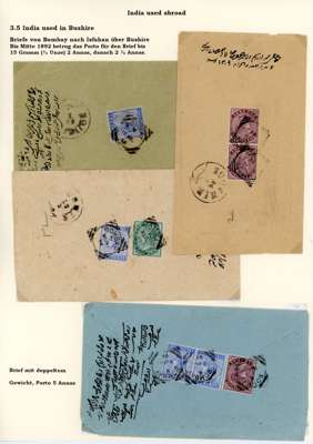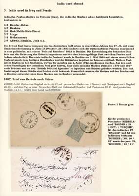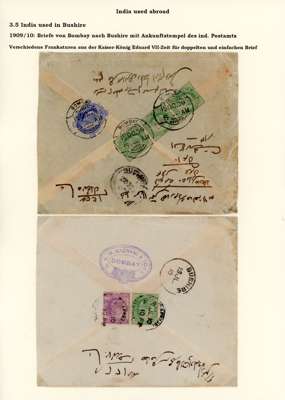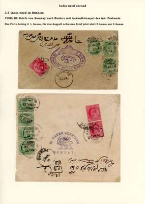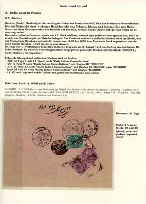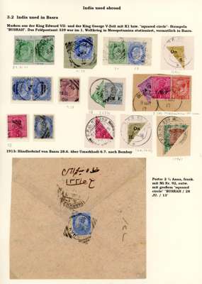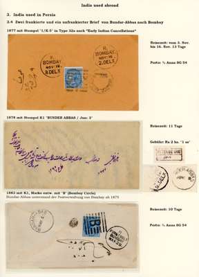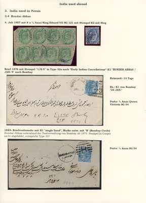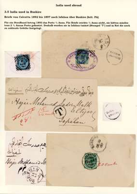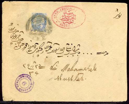 PERSIAN GULF: 1870s-1920s collection of used abroad in the Persian Gulf, organised by area on leaves with covers including: Bandar Abbas, Basra with incoming and outgoing mail, Bushire with multiples and blocks, numerous covers, assorted cachet marks and censored marks, KGV 2a6a cancelled by Ahwaz cds marks, KGV ½a Henjam cds in blue on piece, Linga with blocks and Mahommera with covers, Basra with KGV bisects on piece with F.P.O markings, generally fair to fine condition an interesting lot.