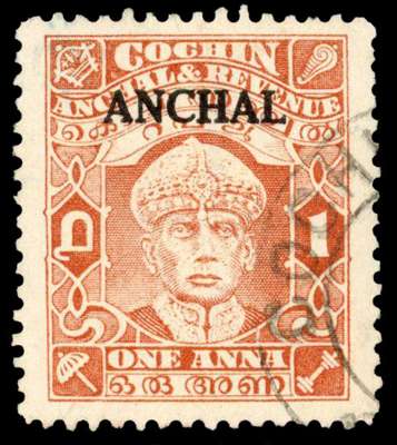 1939 1a brown-orange (recess) optd ‘ANCHAL’ type 19, variety WATERMARK INVERTED, used by neat local cds, leaving much of design clear, very fine and rare SG 72w £500