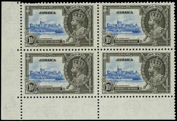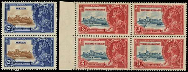 1935 mostly mint Silver Jubilee varieties: Jamaica 1d R.7/1 flagstaff on right hand turret, used with wavy line cancel, 1½d l/l corner marginal block of 4 unmounted o.g., with R. 9/1 extra flagstaff variety fine o.g. Malta 2½d vertical pair, the top with R.9/1 extra flagstaff variety unmounted o.g., Trinidad and Tobago 3c block of 4, one with R.9/1extra flagstaff variety, o.g. Turks and Caicos, ½d and 1s singles both showing R10/6 kite and vertical log o.g. and Cayman Islands 6d with a dash by turret but not the listed variety. (14)