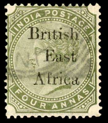 1895-96 4a slate-green opt type 8 on India, variety ‘Br1tish' for ’British' R10/2, lightly cancelled by part Kilindini squared circle, odd shortish perfs and trace of crease at right, otherwise fine and scarce. SG 55ba £1100
