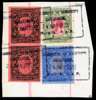 1922 20r purple & blue on blue, 50r dull rose-red and dull greyish green and 100r purple & black on red as vertical pair, fiscally used on piece, cancelled by Registration of Documents Department Nairobi boxed h/s in black for 25 MAR 1922, light horizontal crease at foot affecting 20r otherwise fine, attractive. SG 60-62
