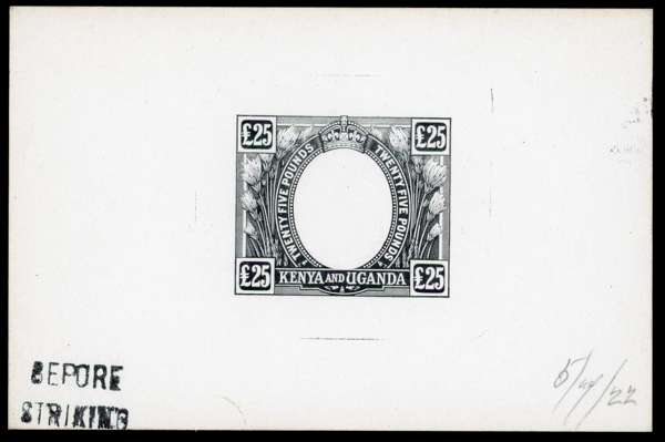 1922-27 KGV £25 die proof of the outer frame on glazed card (92x60mm) endorsed ‘BEFORE HARDENING’ and dated 5/7/22 in pencil m/s, very fine, a highly attractive proof. SG 102var