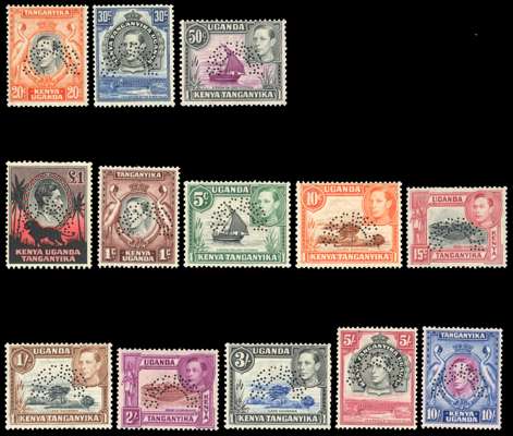 1938 original set of thirteen to £1 black & red, perf ‘SPECIMEN’ (type D20) large part o.g. some imperfections 15c with repair at top, otherwise still of fine appearance, a difficult set. SG 131s-151s £1000