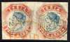 1854 4a blue and red, fourth printing (Head Die III Frame Die II) pos. 13-14 horizontal pair, touching to good surrounding margins, used by two strikes B-172 type 7 octagon for Singapore, along with London tombstone Paid mark in red, some surface soiling, still a rare multiple. SG Z67 £4000+