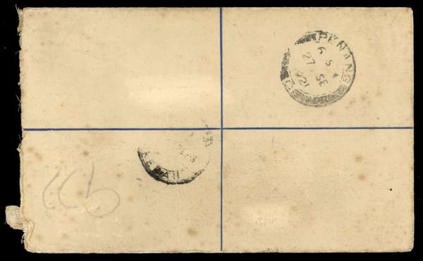 POSTAL HISTORY: 1921 10c blue registered stationery envelope (size G) to Penang uprated with 2c dull green pair tied ‘JITRA/24SEP 21’ cds and Penang arrival on reverse. Opening faults etc still a rare origin.