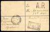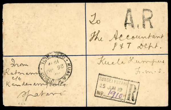 POSTAL HISTORY: 1919 10c blue registered stationery envelope (size G) to Kuala Lumpur, franked additionally 4c and 10c tied “SUNGEI PATANI/25 JU 1919” d/r cds, Penang transit alongside. On reverse boxed Sungei Patani registration mark and “A.R.” handstamp with Kuala Lumpur arrival mark. Some soiling still a scarce origin.