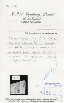 1897 2c on half of 5c blue, the Kuala Lipis manuscript provisional, on small piece with part Raub CDS of 25 AU. Surcharge and initials in different inks. BPA Certificate (1979). SG 18, £450
