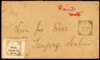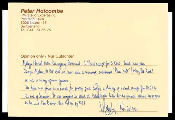 POSTAL HISTORY: 1900 local cover bearing emergency provisional “Postal Receipt for 3 Cent” label cancelled by squared circle “TANJONG MALIM/Post Office/31 OC/1900” cds (Proud D3) with second strike at right with manuscript “Paid WPF” in red Holcombe certificate (1991. Some soiling still a rare item.
