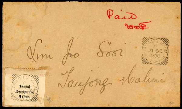 POSTAL HISTORY: 1900 local cover bearing emergency provisional “Postal Receipt for 3 Cent” label