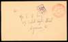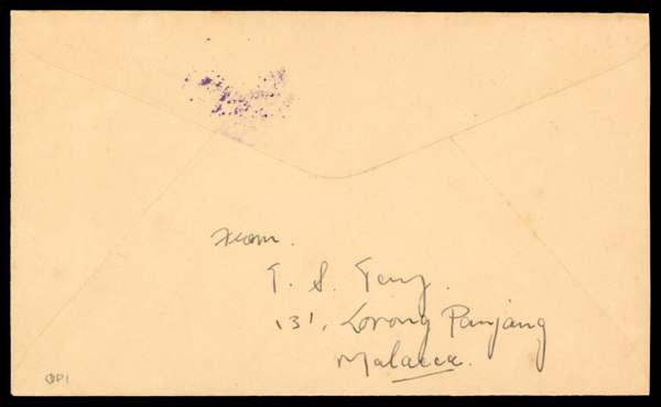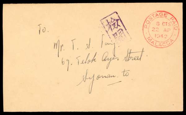 POSTAL HISTORY: 1942 stampless cover to Singapore with large d/r “POSTAGE PAID/8CTS/22 AP 1942/ MALACCA” cds in red (type PD2) with violet chop alongside. Fine and scarce.